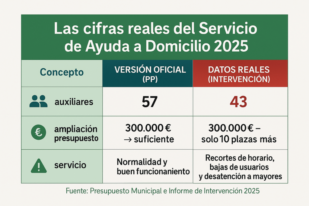 Sin embargo, los documentos oficiales cuentan otra historia. Tal como refleja el informe de Intervenciรณn, el presupuesto de 2025 solo contemplรณ 43 auxiliares, no 57 como asegura el concejal.