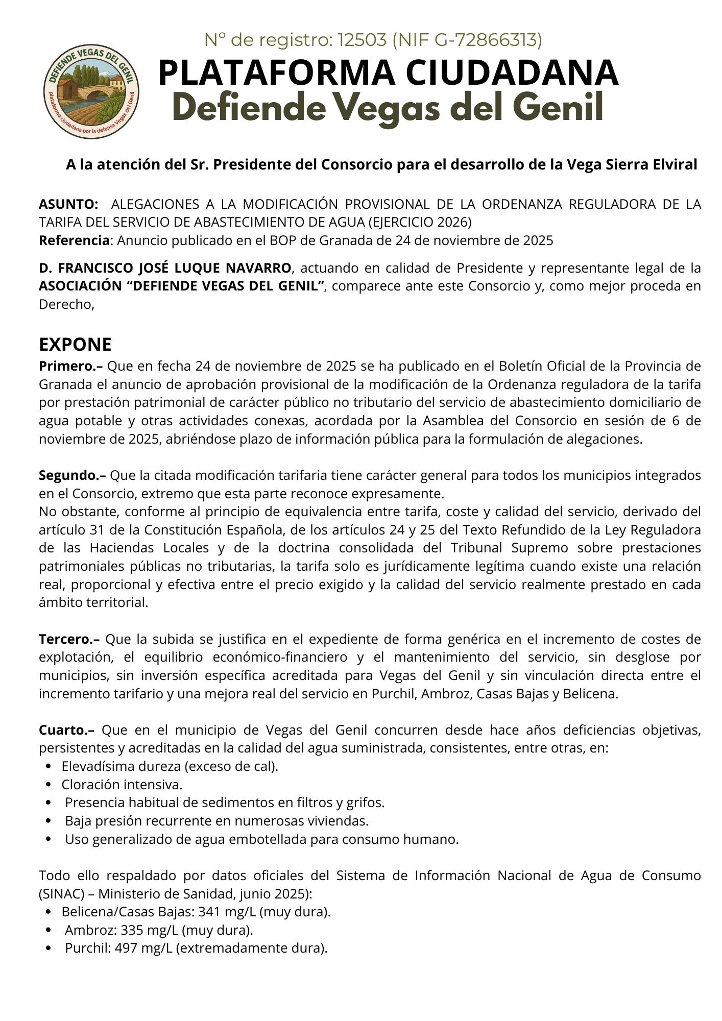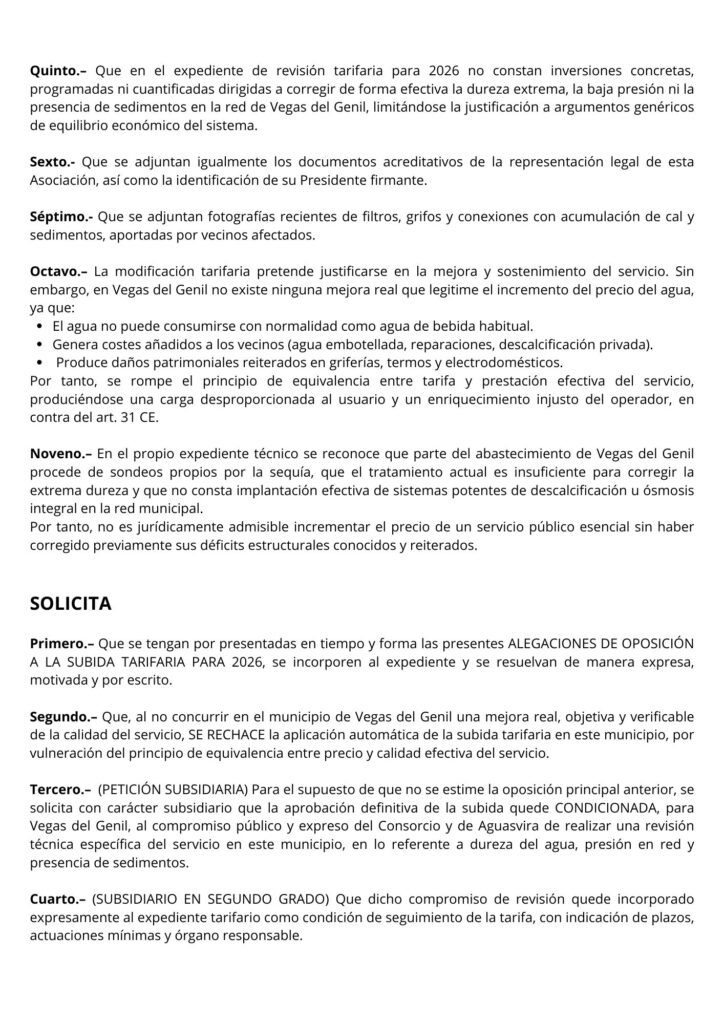 Defiende Vegas del Genil ha presentado una alegación formal de oposición a la subida de la tarifa del agua para 2026 ante el Consorcio con fecha 5 de diciembre de 2025.