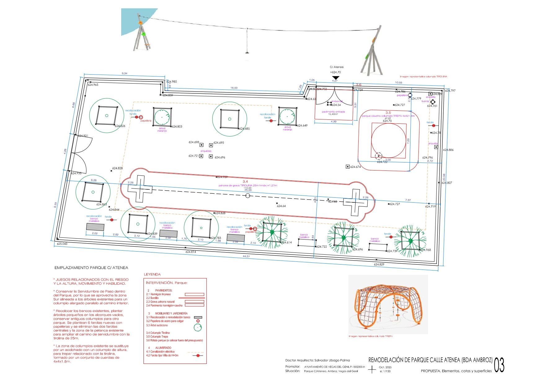 Nos alegra que se invierta, aunque sea de forma mínima, en un parque como el Atenea, que durante años ha permanecido prácticamente abandonado y sin mantenimiento, a pesar de ser el principal espacio infantil de esta zona de Ambroz. La actuación prevista introduce dos elementos principales de juego activo: una tirolina de 25 metros paralela al camino sur del parque y un columpio tipo trepa sobre superficie acolchada de caucho para niños a partir de unos 10 años, eliminando para ello la antigua zona de petanca y reorganizando el espacio. La intervención incluye además la reparación del pavimento de albero, la recolocación de bancos y el desplazamiento de farolas al perímetro para liberar la zona central. La tirolina, que constituye el elemento principal del parque, tiene un coste aproximado de 3.246 euros dentro del presupuesto de la actuación.