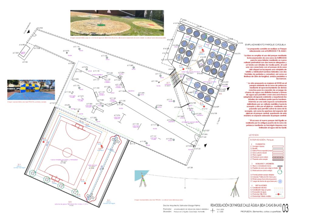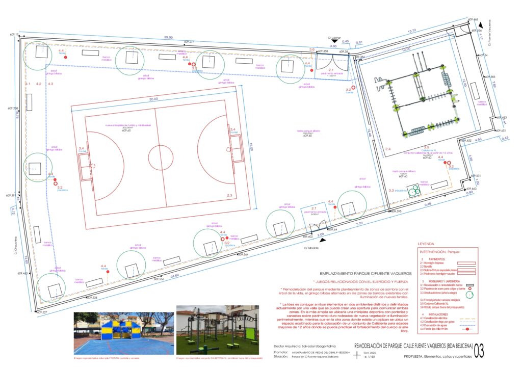La intervención prevista supone ahora una transformación importante del recinto hacia un parque más orientado al juego activo y al deporte infantil. El proyecto contempla la construcción de una minipista deportiva de fútbol y baloncesto de aproximadamente 15 × 20 metros sobre solera de hormigón armado, así como la creación de una nueva zona de juegos infantiles con pavimento continuo de caucho de seguridad en superficie circular. Se renovarán los pavimentos del parque, incluyendo la reparación del albero existente y la ejecución de un acceso con hormigón impreso. Además, se remodelarán los bancos de obra existentes mediante revestimientos prefabricados, se instalarán nuevas papeleras, se plantará arbolado para generar sombra en la zona infantil y se ampliará la iluminación con nuevas farolas perimetrales, mejorando notablemente la seguridad y el uso del recinto.