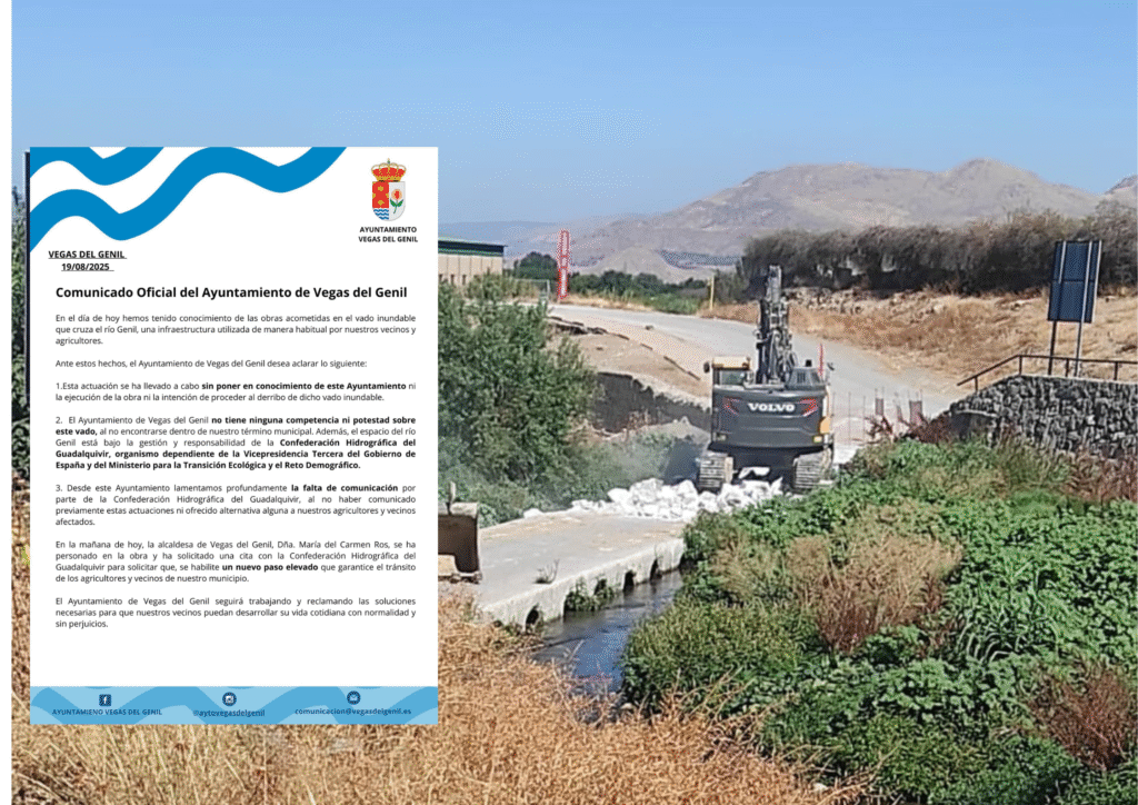 El vado inundable de Vegas del Genil ha sido demolido y la polémica estalla. Documentos oficiales de la Confederación Hidrográfica del Guadalquivir prueban que el Ayuntamiento fue avisado el 14 de marzo de 2024 y no hizo nada. Agricultores y vecinos pierden un paso histórico, mientras el gobierno local de PP y Vox se excusa diciendo que “no era su competencia”. La verdad es otra: lo sabían, callaron y dejaron que Vegas del Genil quedara partida en dos.
