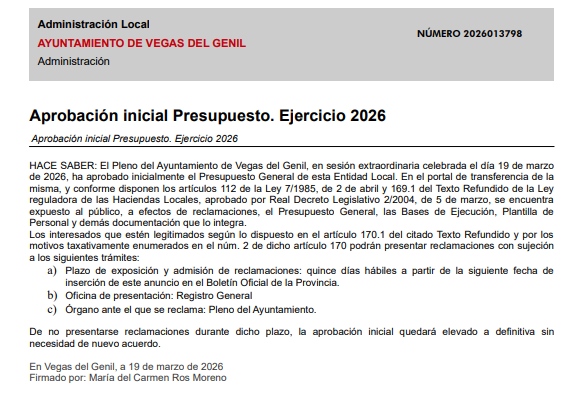 La aprobación inicial del Presupuesto se publicó el 20 de marzo de 2026, por lo que el plazo de 15 días hábiles para presentar alegaciones comenzó el 21 de marzo