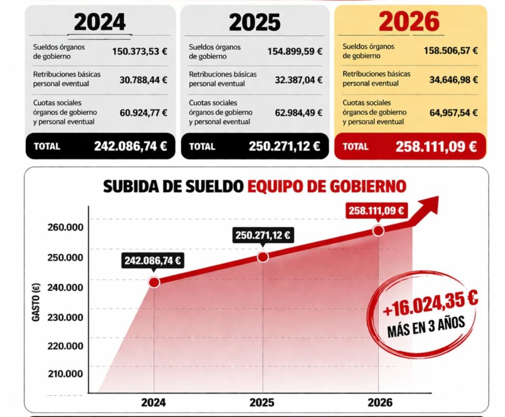 Mientras se recorta en servicios, el equipo de gobierno vuelve a subirse el sueldo. En el presupuesto de este 2026 el incremento salarial del gobierno municipal será del 2,33 %, y se trata de la tercera subida consecutiva del mandato, que nos costará a los vecinos casi 8000 euros