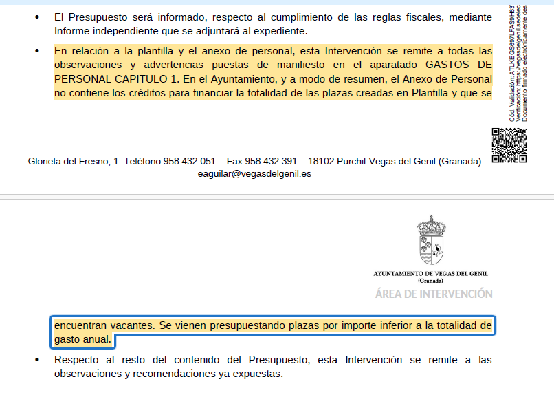 Esta maniobra ha provocado un informe desfavorable de la Intervención Municipal. En su Informe de Intervención sobre el Presupuesto 2025, la Interventora Municipal advierte expresamente que: