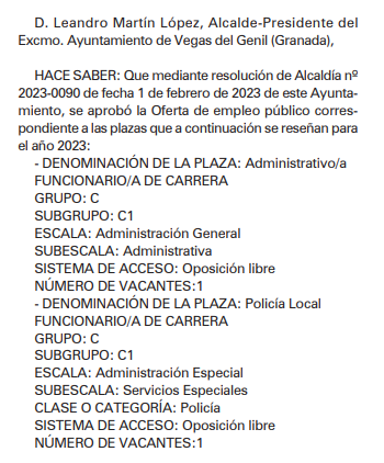 La alcaldesa de Vegas del Genil mantiene sin ejecutar desde hace más de dos años y medio una plaza de Policía Local incluida en la Oferta de Empleo Público 2023, aprobada mediante Resolución de Alcaldía nº 2023-0090 de 1 de febrero de 2023, durante el mandato del anterior equipo de gobierno presidido por Leandro Martín López (PSOE).