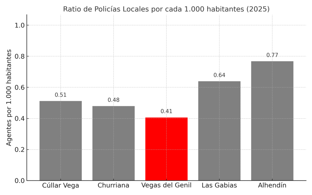Los datos son contundentes: Vegas del Genil cuenta con apenas 5 policías locales en activo para una población de 12.323 habitantes, lo que supone solo 0,41 agentes por cada mil vecinos.