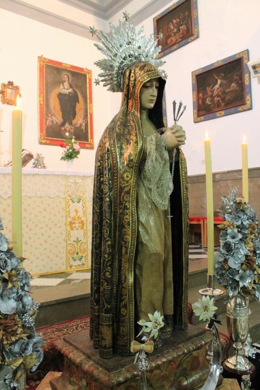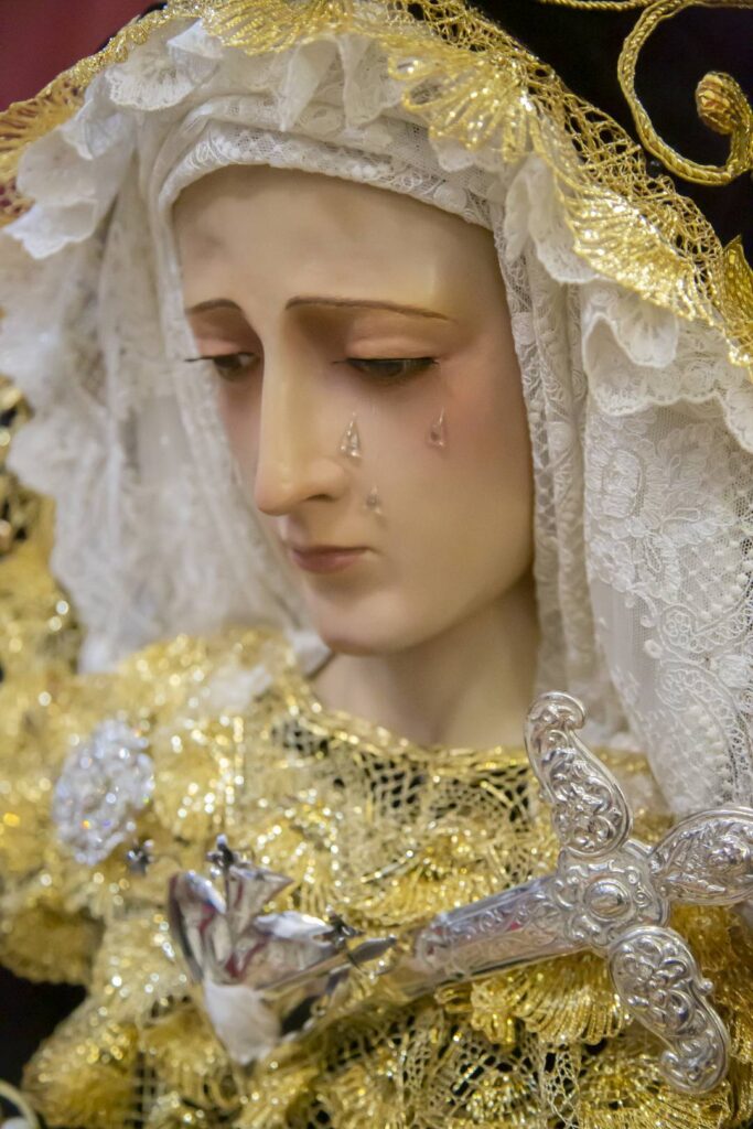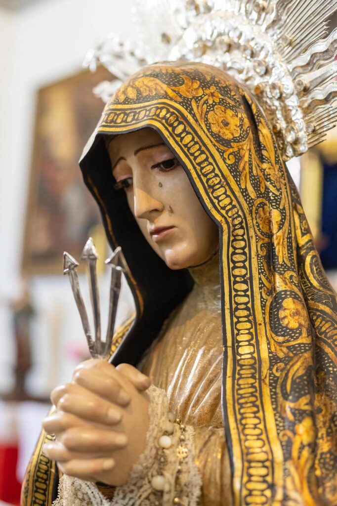 Durante el siglo XVIII, con la extensión de la costumbre de vestir las imágenes, aquella talla fue transformada para adaptarla a la toca, la saya y el manto bordado. Fue una decisión propia de su tiempo, aunque desde la mirada actual supusiera una alteración importante de la obra original. Con los años, la comunidad fue tomando conciencia del valor patrimonial de aquella imagen antigua y, tras su restauración a comienzos de los años 2000, se recuperó su fisonomía primitiva. Desde entonces, la imagen original permanece protegida y es una réplica exacta vestidera la que procesiona cada Viernes de Dolores.