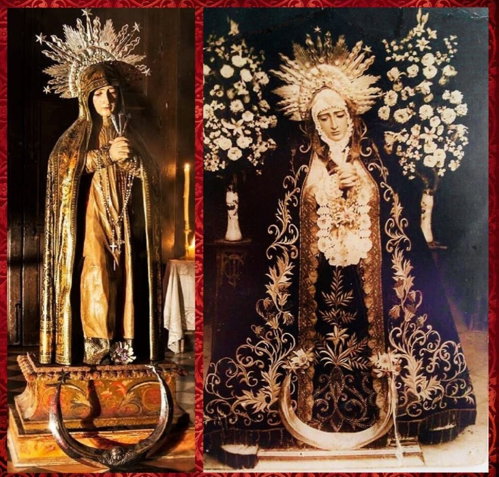Esa comparativa, que hoy puede apreciarse a través de fotografías y testimonios conservados, no solo muestra un cambio estético. Habla de cómo cada generación expresó su amor a la Virgen según la sensibilidad de su tiempo. Primero desde la maestría de la madera policromada; después desde la solemnidad del terciopelo negro, el bordado en oro y el ajuar procesional. Dos maneras de mirar a la misma Madre. Dos épocas distintas latiendo sobre una misma devoción.